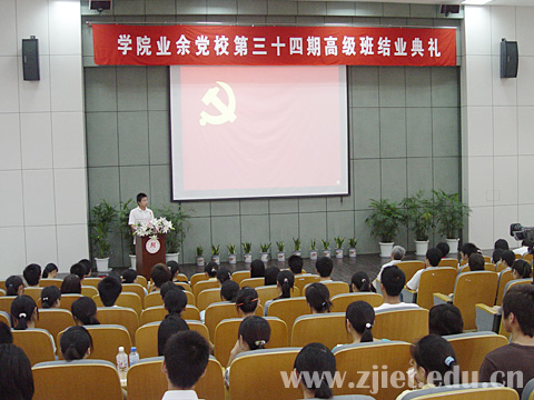 2007年6月21日,学院业余党校第34期高级班结业典礼在图书馆报告厅举行。院党委组织部沈贵林老师、院党委宣传部副部长潘春胜老师、院团委书记吴刚群老师和各系党总支书记、学生党支部书记、团委副书记及学生代表出席结业典礼。典礼由业余党校34期高级班班主任裘永晓老师主持。