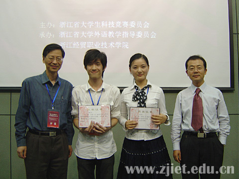 竞赛分为公共外语甲、乙组和英语专业组,经过上、下午两轮复赛,各组前十名选手进入晚上的决赛。最后,来自浙江商业职业技术学院的董海萍和绍兴越秀外国语职业学院的庞敏荣获公外组特等奖,他们将代表浙江省参加11月在北京举行的全国总决赛;我院国际贸易系应用英语专业20061班的黄蒙丽同学荣获英语专业组二等奖。