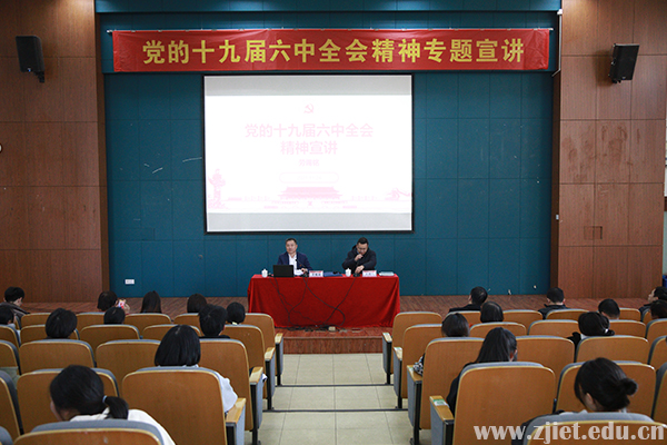 劳赐铭紧紧围绕党的十九届六中全会精神和全会审议通过的《决议》,从深刻把握全会的基本概况和重大成果、深刻把握《决议》的核心要义和丰富内涵等方面进行了系统阐述和深入解读,学习传达了省委干部大会精神,解读了浙江省委对学习贯彻六中全会精神的部署,并对学校如何学习贯彻全会精神提出明确要求。