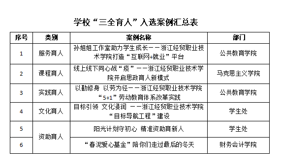 近日,浙江省教育厅主编的《浙江省高校“三全育人”综合改革理论与实践》丛书在全省高校“三全育人”综合改革推进会上首发,我校《线上线下同心战“疫”》、《目标引领 文化浸润》、《阳光计划守初心 精准资助育新人》、《以勤修身 以劳为径》、《“春泥爱心基金”陪你们走过最后的冬天》、《孙姐姐工作室助力学生成长》等6个案例成功入选。